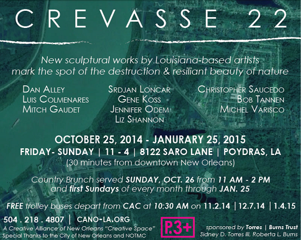 “Crevasse 22” Oct. 25th – Jan. 25th; Fri-Sun 11-4 (8122 Saro Ln. Poydras, LA). On Sun. Jan. 4, CANO is hosting a Country Brunch Reception at this location. 11-2. Read more about the December brunch here.